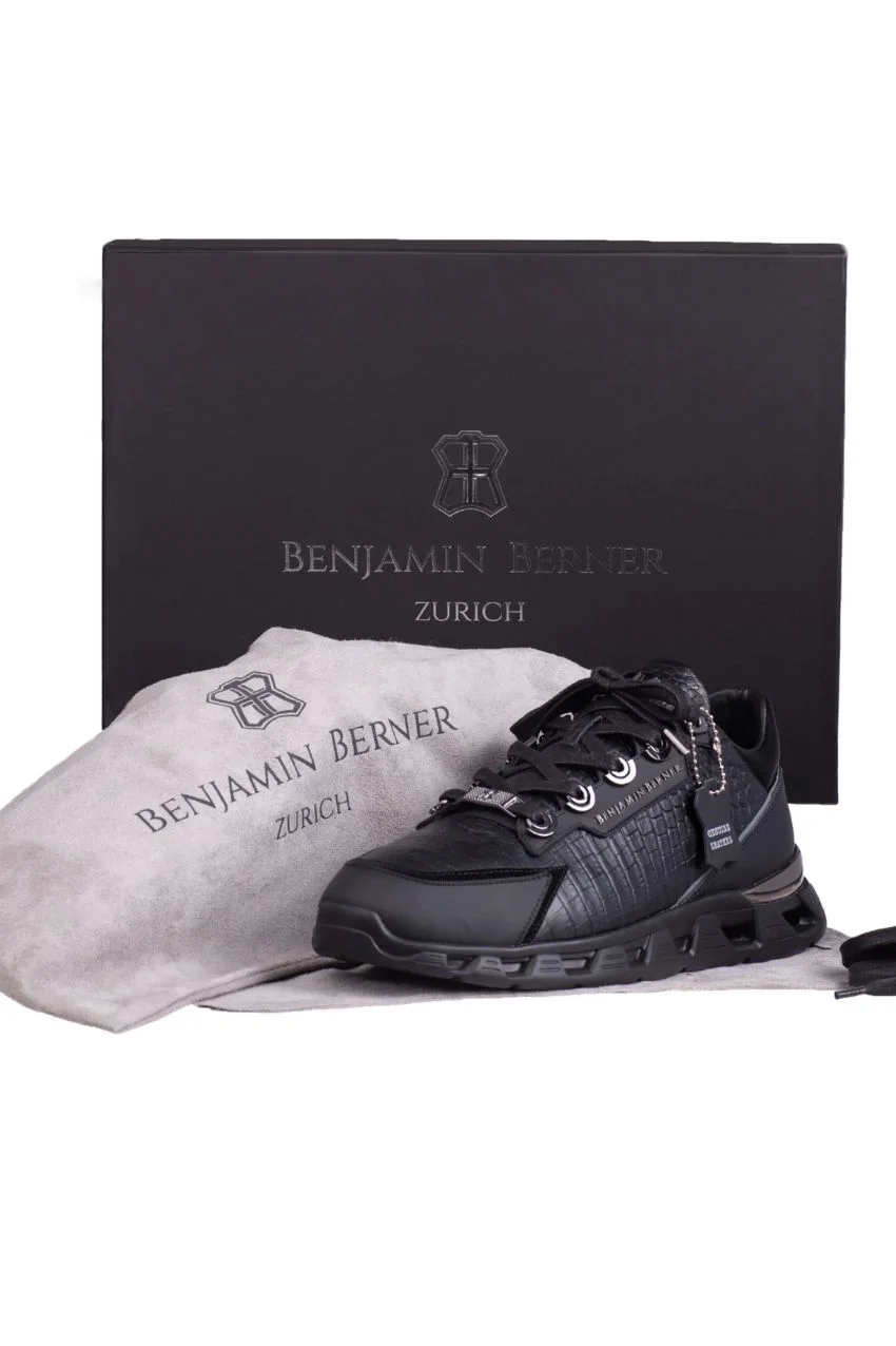 Benjamin Berner High Tech Runner Alligator Effect Black. Dit is een sneaker van het merk Benjamin Berner. Deze schoenen zijn 100% handgemaakt met het hoogste kwaliteit nappa leer. De schoen is zwart van kleur en heeft het ”Alligator print” wat zorgt voor een elegante en stoere uitstraling.