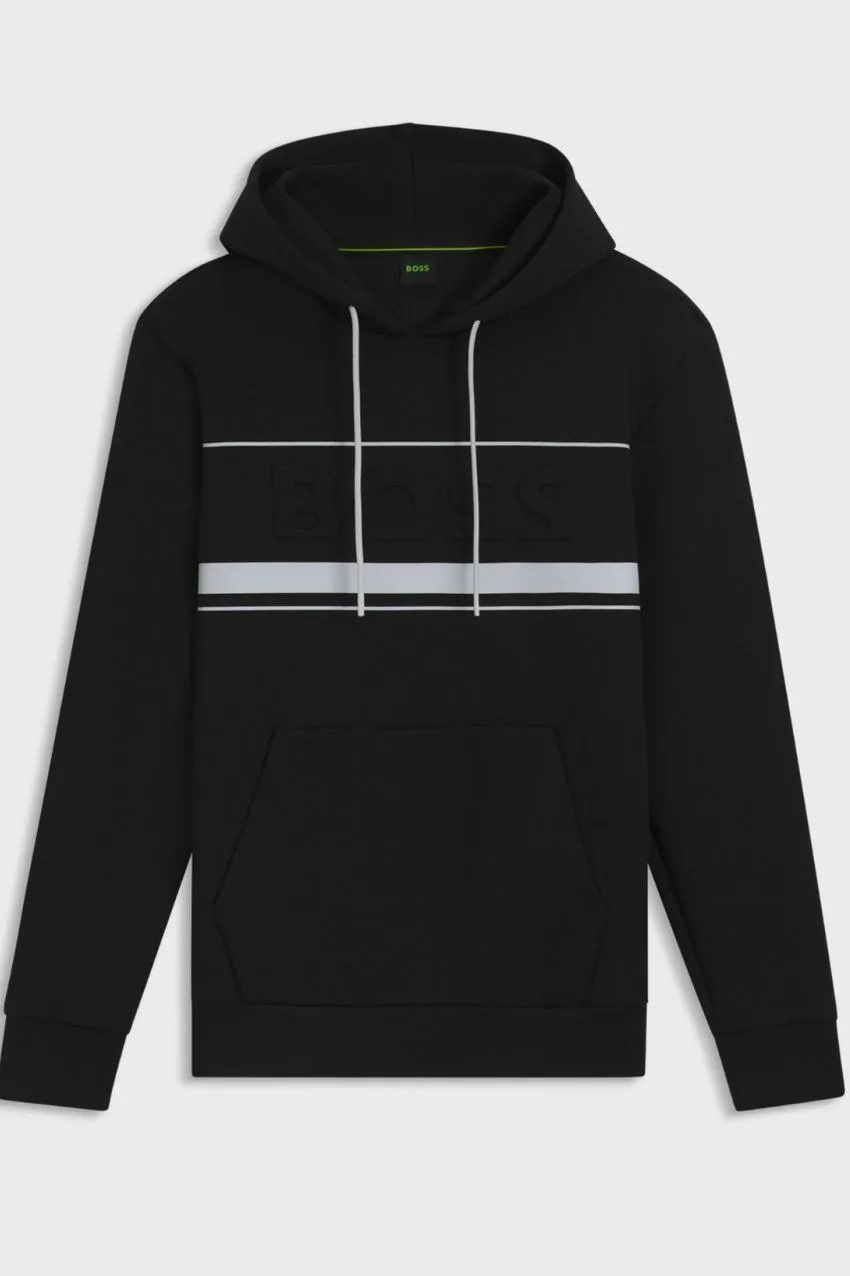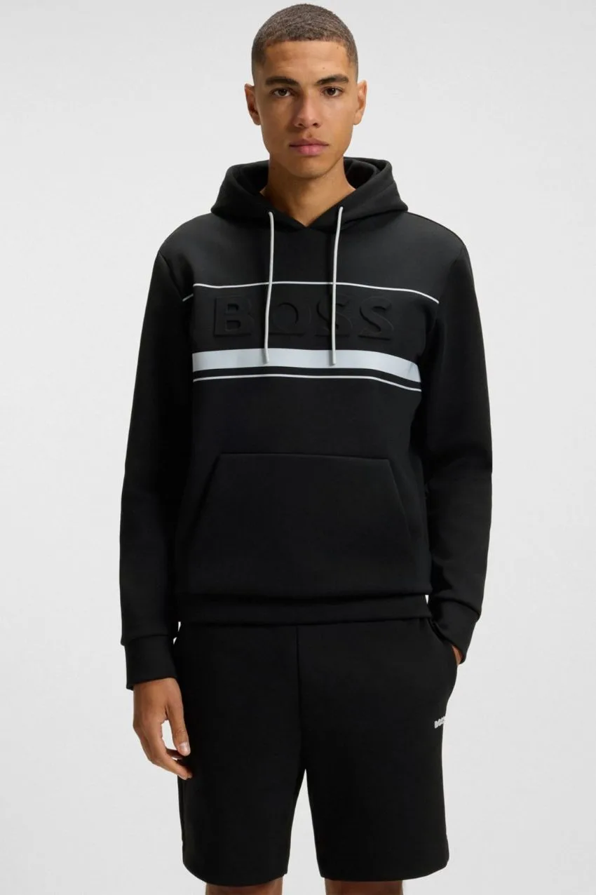 BOSS Soody Zone Sweater Zwart. Ga voor een moderne en sportieve look met de BOSS Soody Zone sweater. Deze stijlvolle hoodie is gemaakt van een zachte katoenmix en biedt optimaal draagcomfort, of je nu onderweg bent of ontspant in je vrije tijd. De sweater heeft een regular fit en is afgewerkt met een verstelbare capuchon, kangoeroezak en subtiel BOSS-logo op de borst.