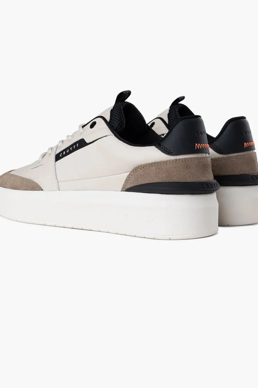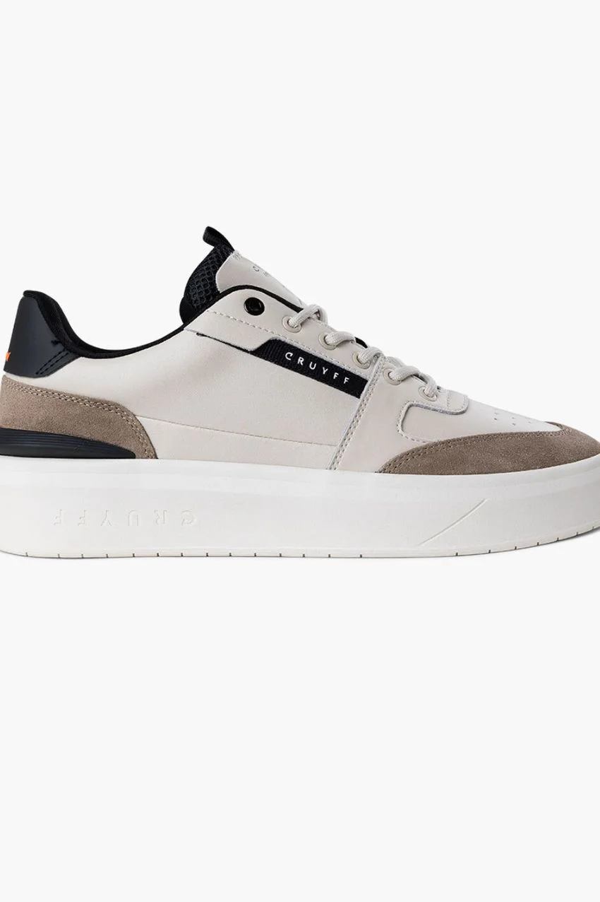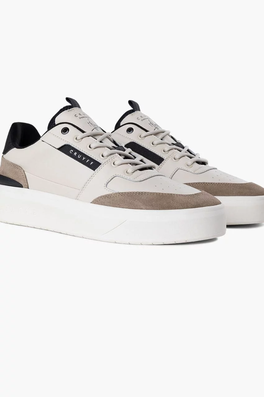 Dit zijn sneakers van het merk Cruyff. De sneakers hebben een kleurenmix van beige, wit en zwart. De sneakers hebben een sportieve look en zijn geschikt voor elke gelegenheid. Op de zijkant van de schoen is duidelijk het Cruyff logo te zien.
