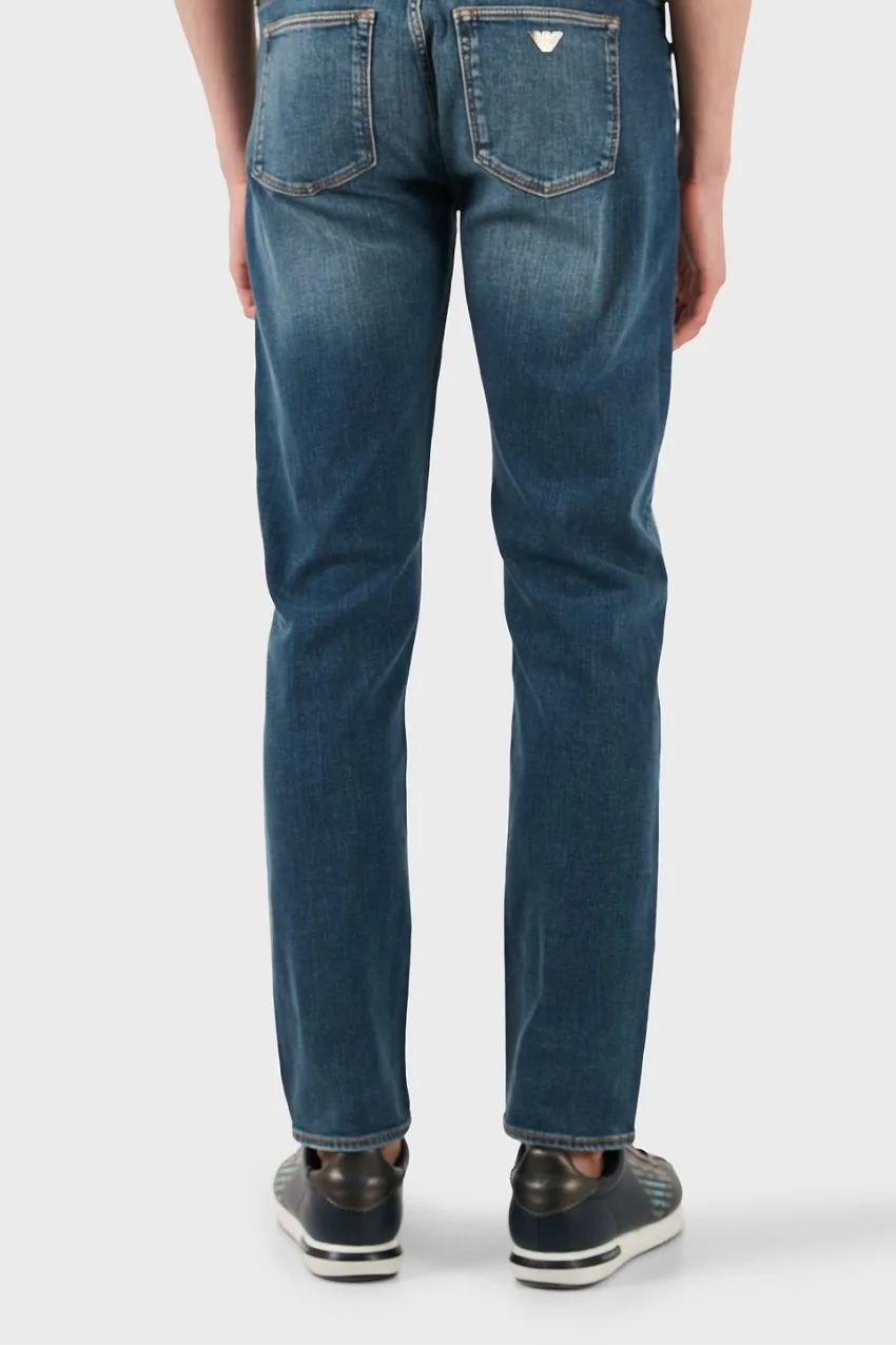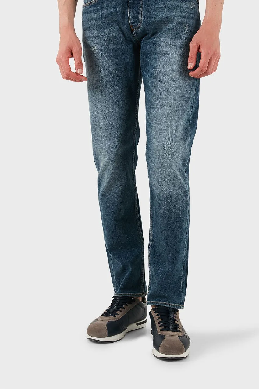 Emporio Armani Jeans Regular Fit Denim Blue. Ervaar het perfecte samenspel tussen stijl en comfort met deze blauwe stretch jeans van Emporio Armani. Gemaakt van hoogwaardige stretch-denim (98% katoen, 2% elastaan), biedt deze jeans optimale bewegingsvrijheid zonder in te leveren op pasvorm of uitstraling.