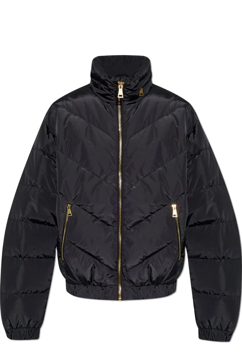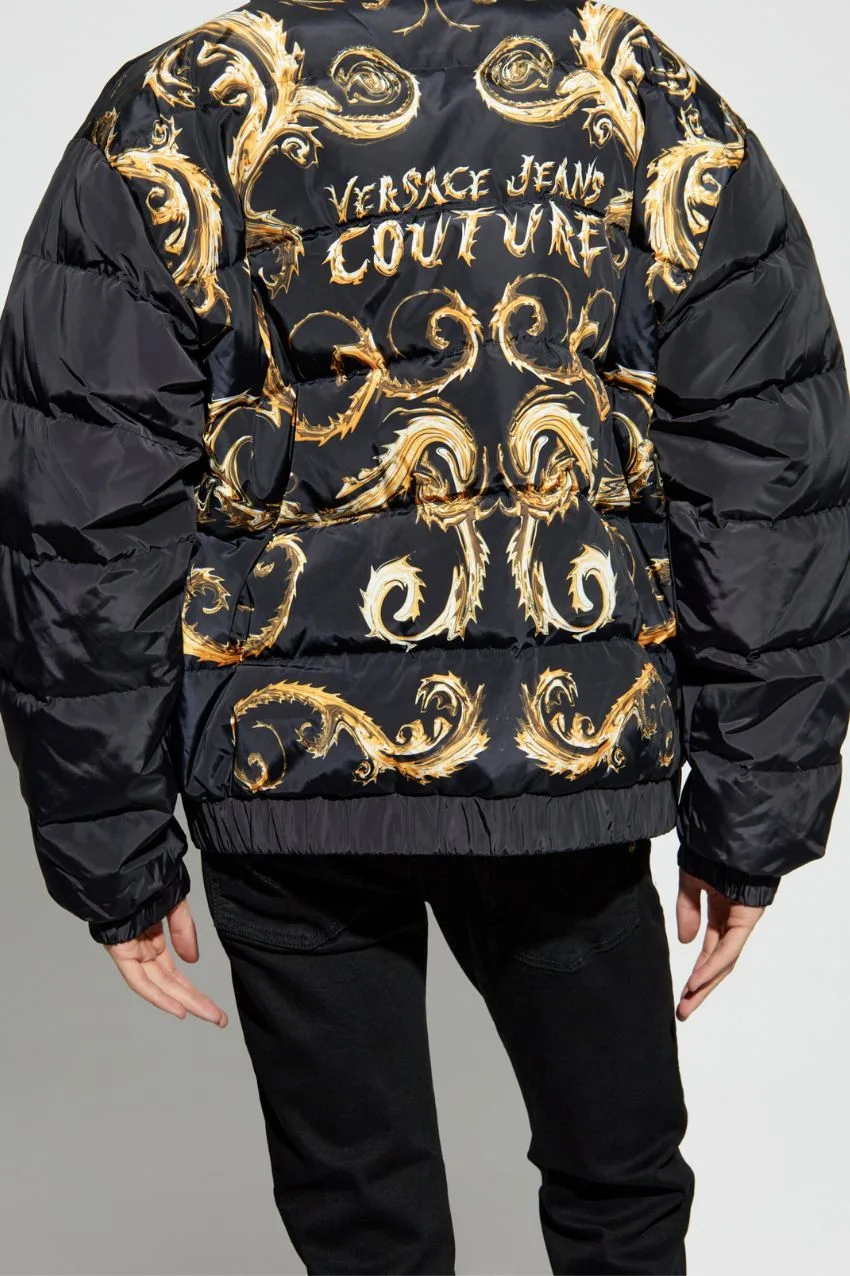 Versace Jeans Coutrure Black Puffer Jacket. Dit is een puffer jas van het merk Versace Jeans Couture. Deze jas van Versace heeft de echte iconische versace uitstraling met de kleuren zwart en goud, zo is aan de voorkant de ritssluiting van goud. Aan de achterkant is er een print te zien van versace met gouden patronen en een tekst van versace. De jas heeft geen capuchon maar wel een grote open kraag.