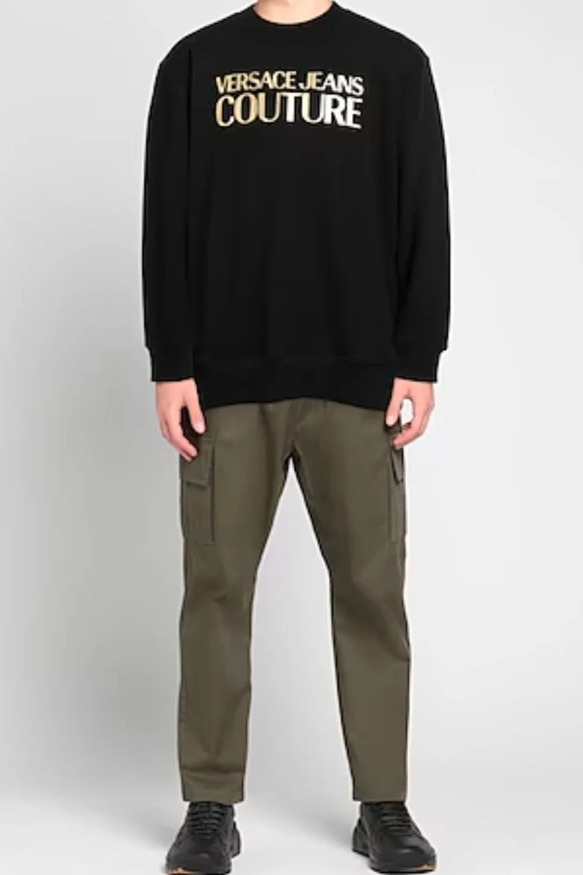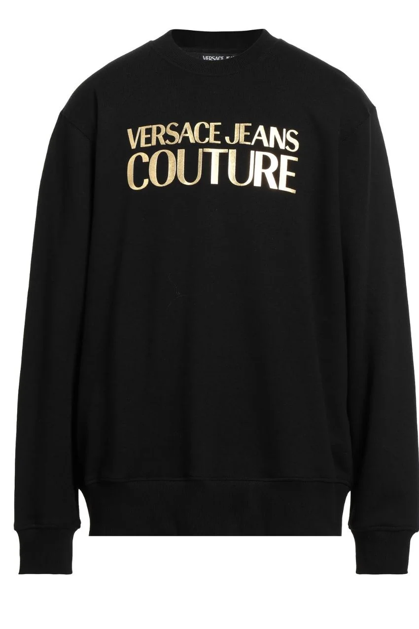 Versace Jeans Couture Sweater Black. Dit is een sweater van het merk Versace Jeans Couture. De sweater heeft lange mouwen en een klassieke ronde hals. De sweater is voorzien van het Versace logo aan de voorkant met gouden letters. De sweater heeft een regular fit pasvorm.