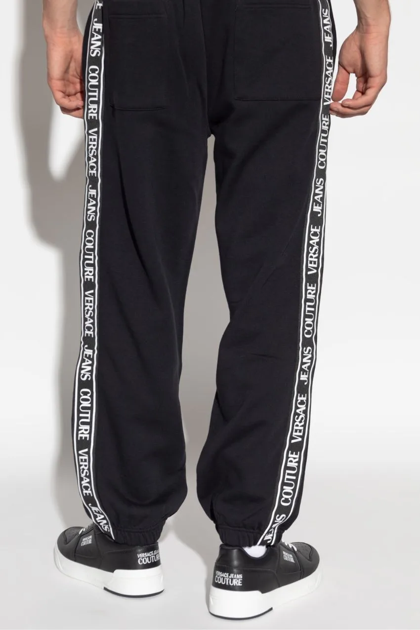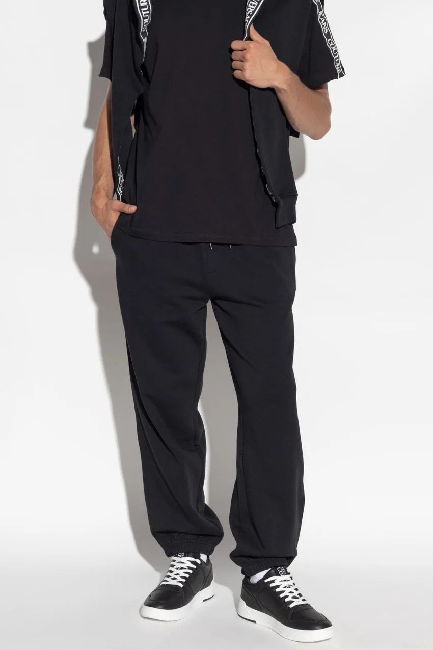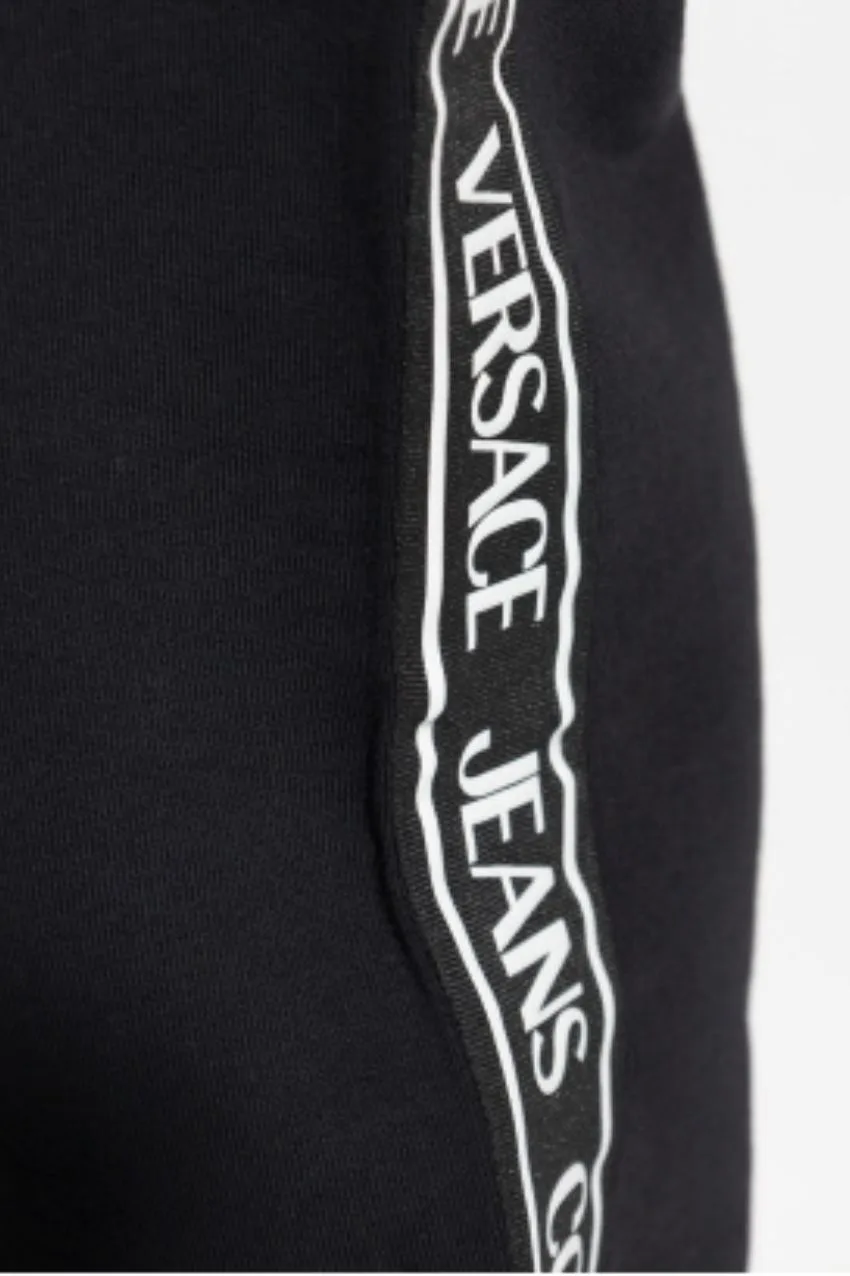 Verscae Jeans Couture Sweatpants Black. Deze zwarte sweatpants van Versace Jeans Couture combineren comfort met een uitgesproken stijl. Het design wordt gekenmerkt door het iconische logo dat langs de zijkant is geprint, waardoor de broek een moderne en luxueuze uitstraling krijgt.Gemaakt van een zachte katoenmix bieden deze sweatpants een perfecte pasvorm en hoog draagcomfort. De elastische tailleband met trekkoord en de praktische zijzakken zorgen voor functionaliteit, terwijl de regular fit een relaxte look garandeert. Te combineren met bijpassende sweater voor complete look.
