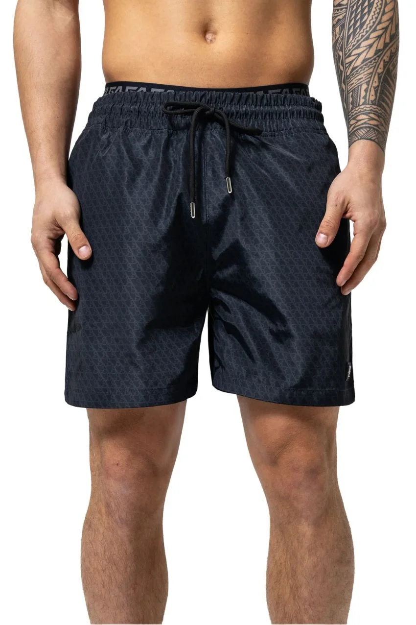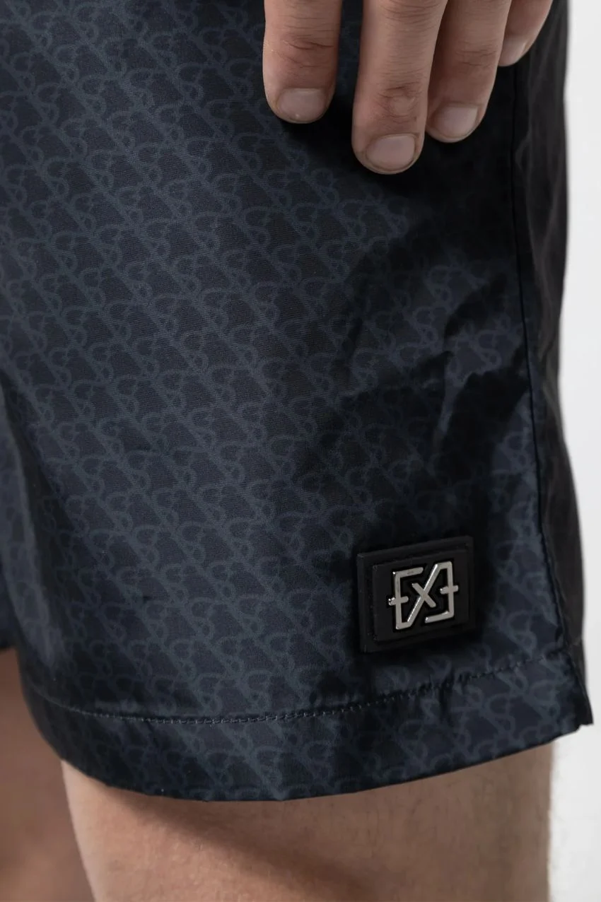 XPLCT Studios Shade Swimshort Black. Dit is een zwembroek van het merk XPLCT Studios. De zwembroek heeft een toon-op-toon koord met een elastieken tailleband. De broek heeft een allover zwarte logoprint, twee zijzakken en een achterzak met ritssluiting.De broek heeft een metalen rubberen logo op het linkerbeen en de broek is uitgevoerd in 100% polyester.
